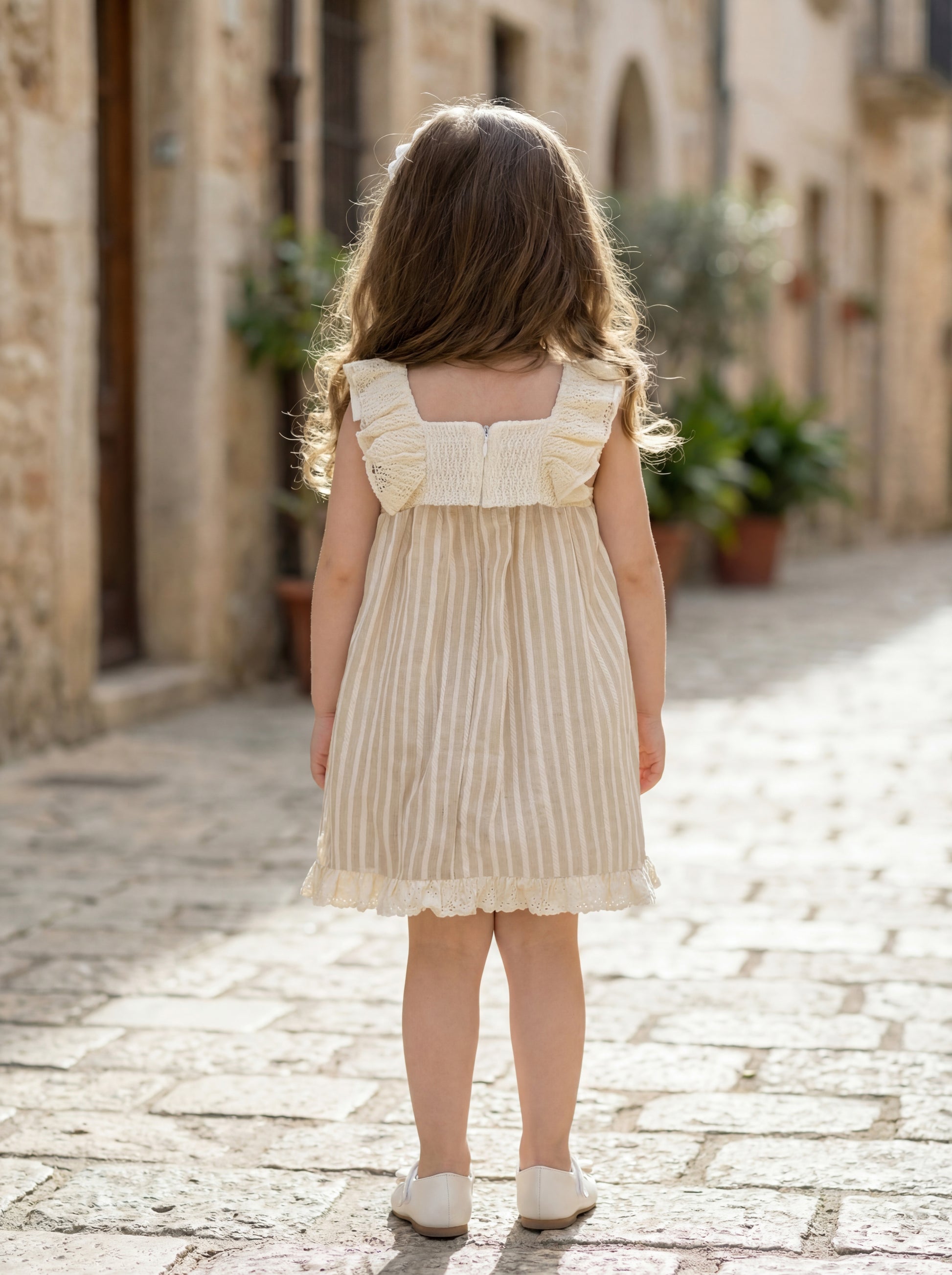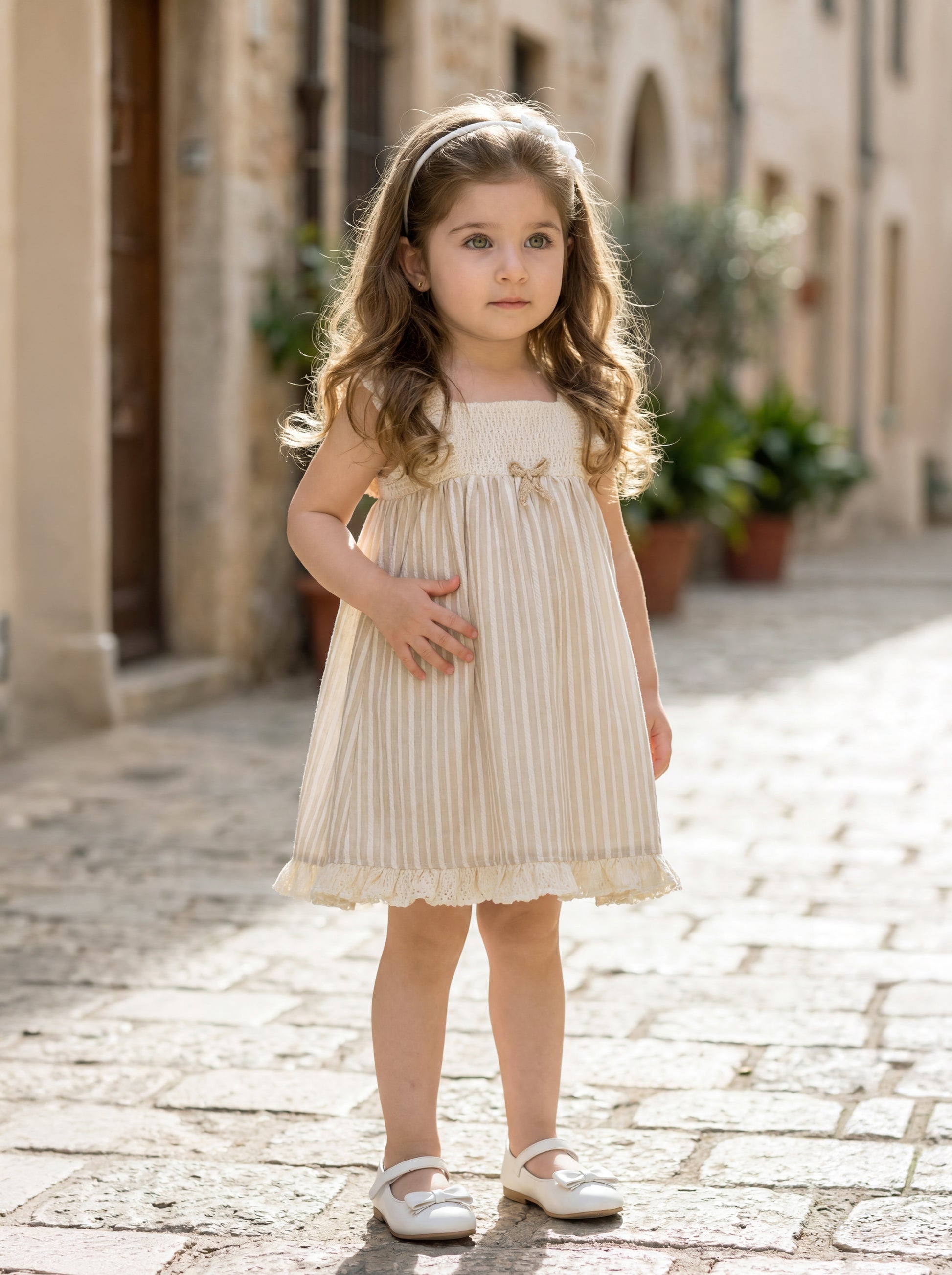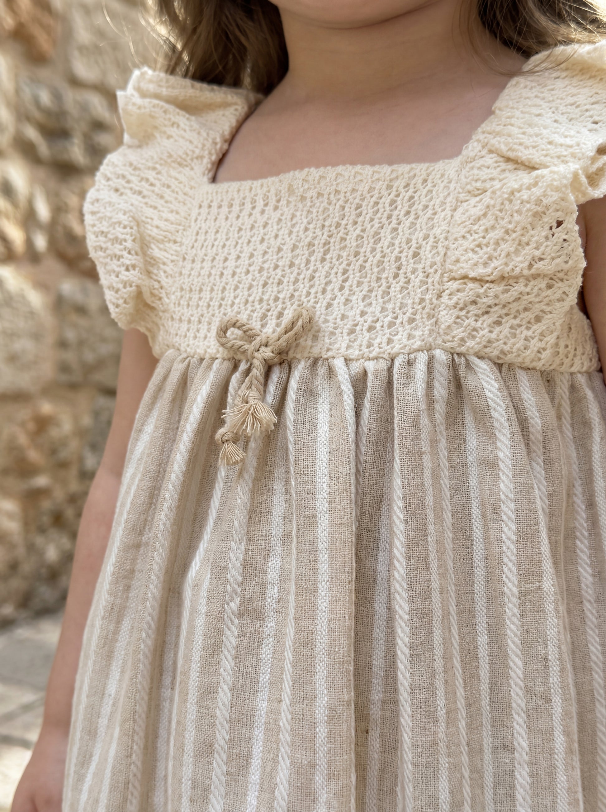Description: A charming A-line dress features delicate vertical pinstripes and an elegant empire waist accented by a small bow.